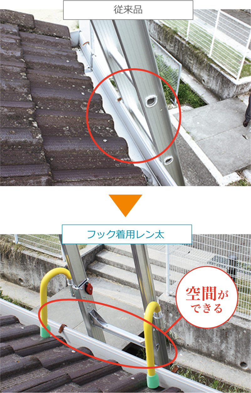 従来のはしごは立てかけると屋根に接触(上写真)し、雨樋を壊す可能性があります。
