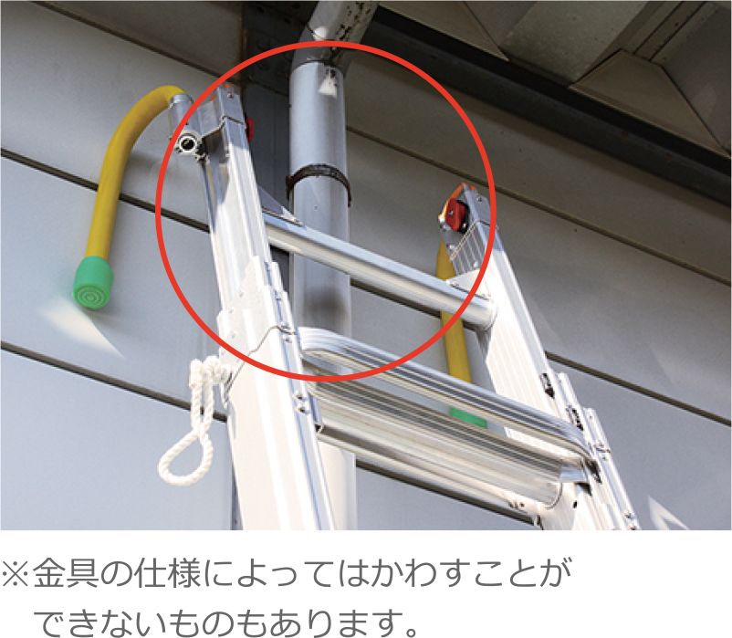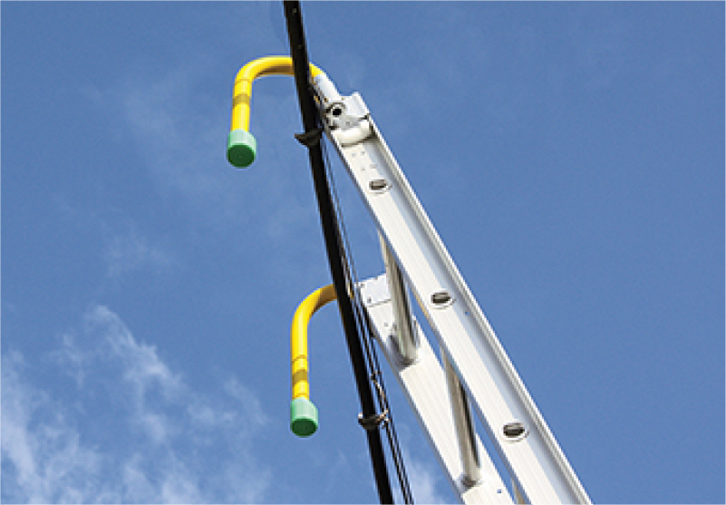 屋根上昇降セットのフックは、屋根への昇降時だけでなく、壁面や入隅立てかけ時にも最適です。