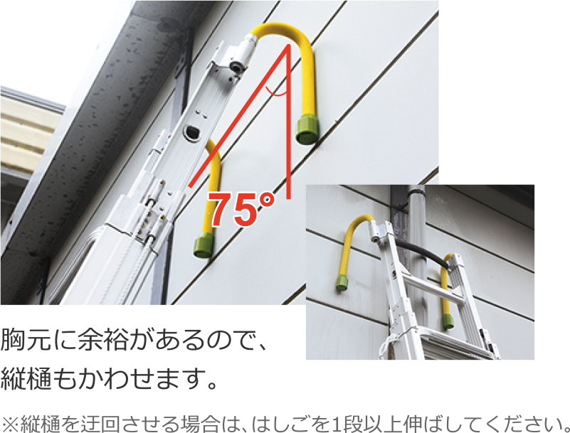 フックが壁に接触すれば、はしごの立て掛け角度は75°になり、縦樋もかわすことができます。