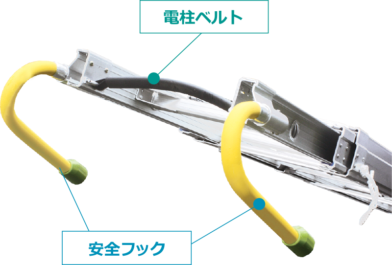 安全フックは、架線作業・壁面立て掛け作業・入隅立て掛け作業と3つの作業シーンでお使い頂けます。
